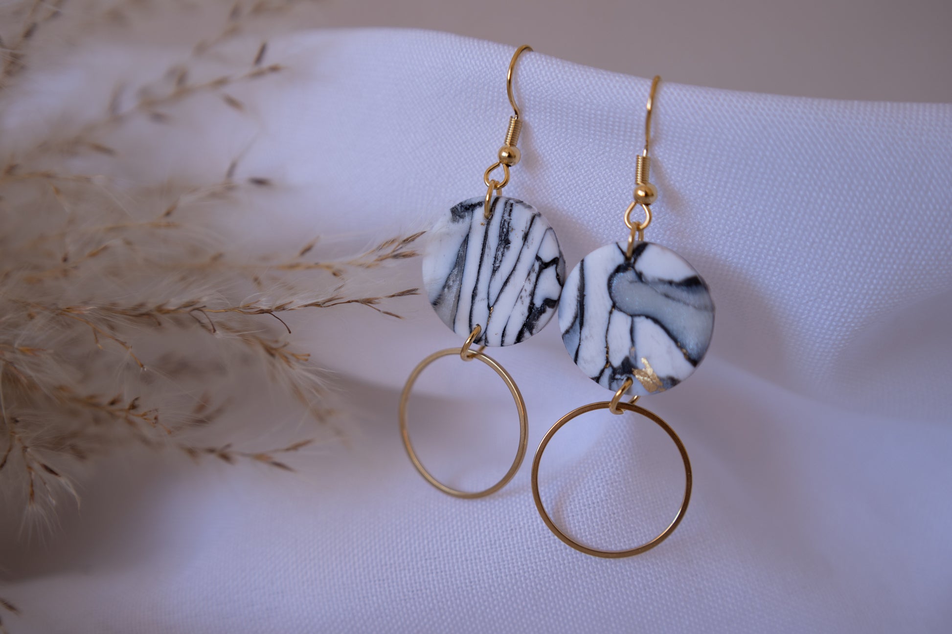 A round earrings that plays with the contrast of black and white, highlighted by delicate golden accents. Handcrafted from polymer clay and gold toned stainless steel, it combines durable materials with elegant contemporary design. Each piece is unique, the result of artisan craftsmanship that embraces the natural variations of polymer clay making every earrings subtly different.