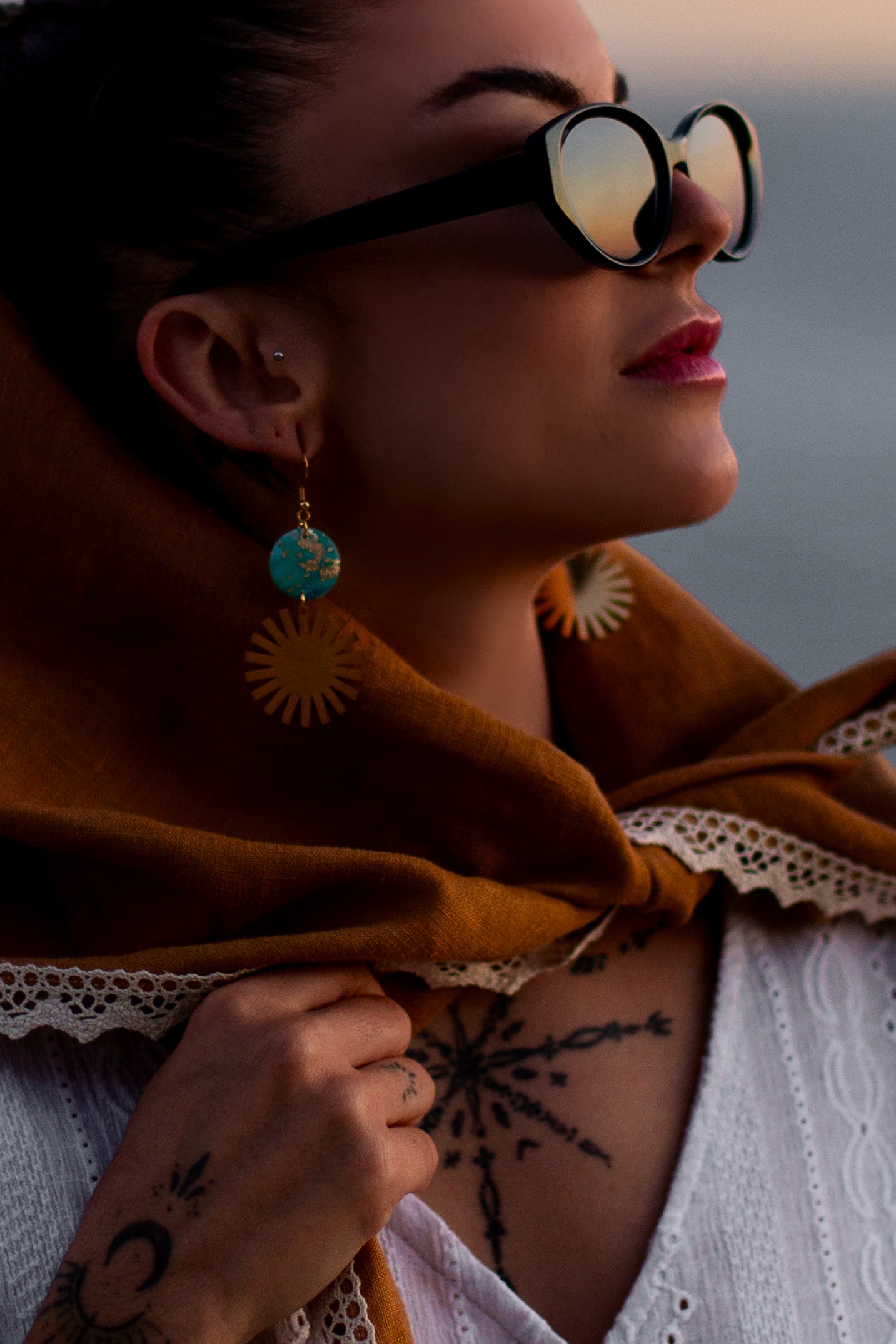 Crafted with lightweight polymer clay in vibrant colors, inspired by Mother Ocean, and sleek stainless steel full sun accents, these earrings are as stylish as they are comfortable. Whether you're adding a pop of colour to your everyday look or complementing a night-out ensemble, these versatile earrings are sure to make a statement.
