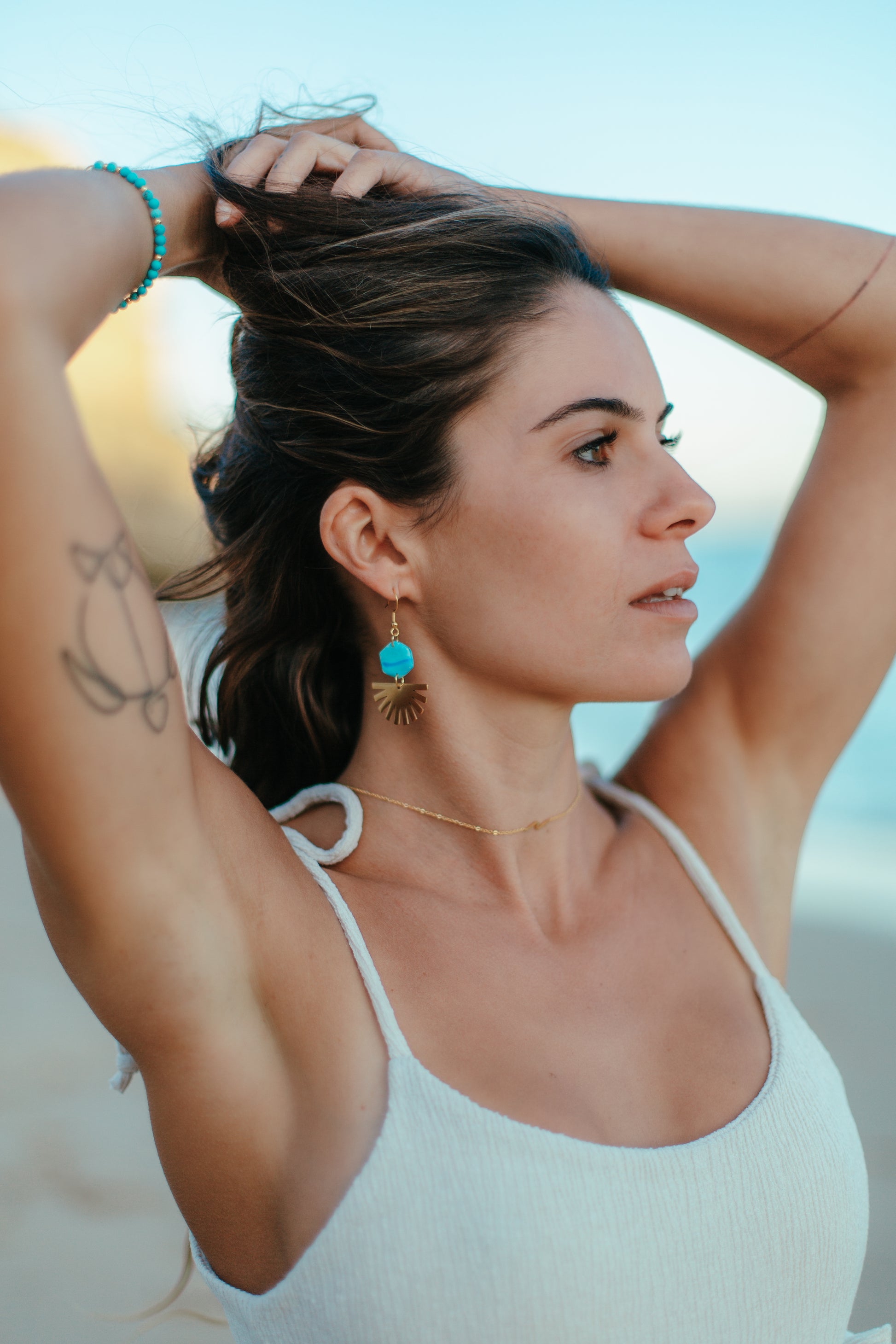 A unique handmade piece crafted from polymer clay with golden half sun details. The bright blue color adds touch of light and freshness, while the stainless steel base ensures durability and comfort .